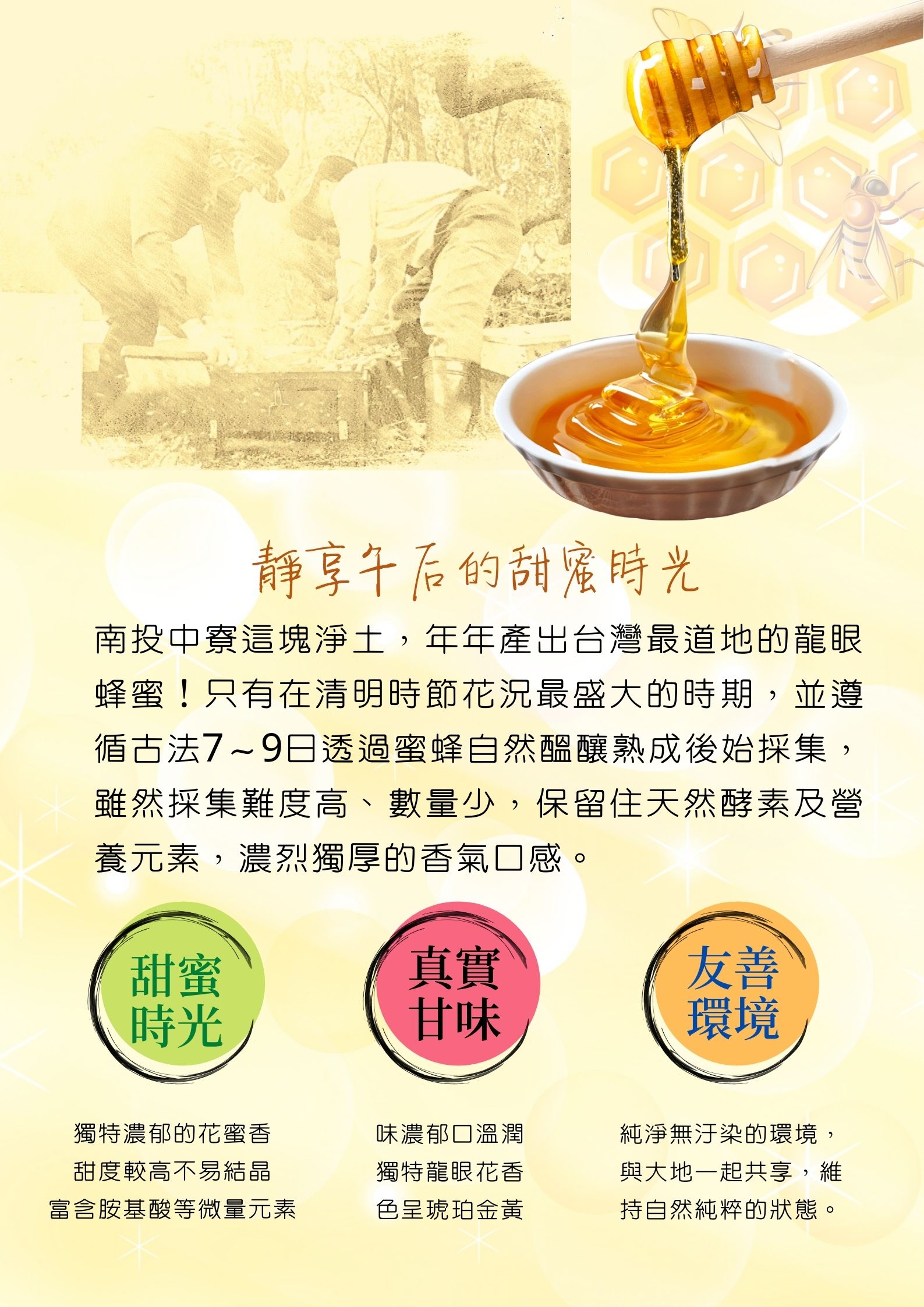 龍眼蜜在清明後是龍眼花盛開之時採收,全花期約9~14天左右,且氣溫需達28~30度才會泌蜜,遵循古法7~9日讓蜂蜜透過蜜蜂自然醞釀熟成後始採集,雖然採集難度高、數量少,保留住天然酵素及營養元素,濃烈獨厚的香氣深受大眾喜愛,甜度相對較高。