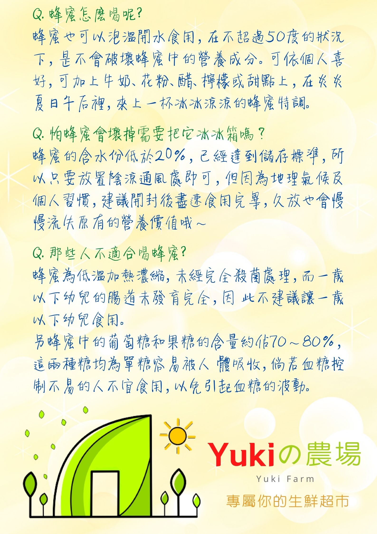 1.蜂蜜為過飽和溶液,遇冷易結晶,故不宜放入冰箱,僅需儲放陰涼處避免陽光直射即可。